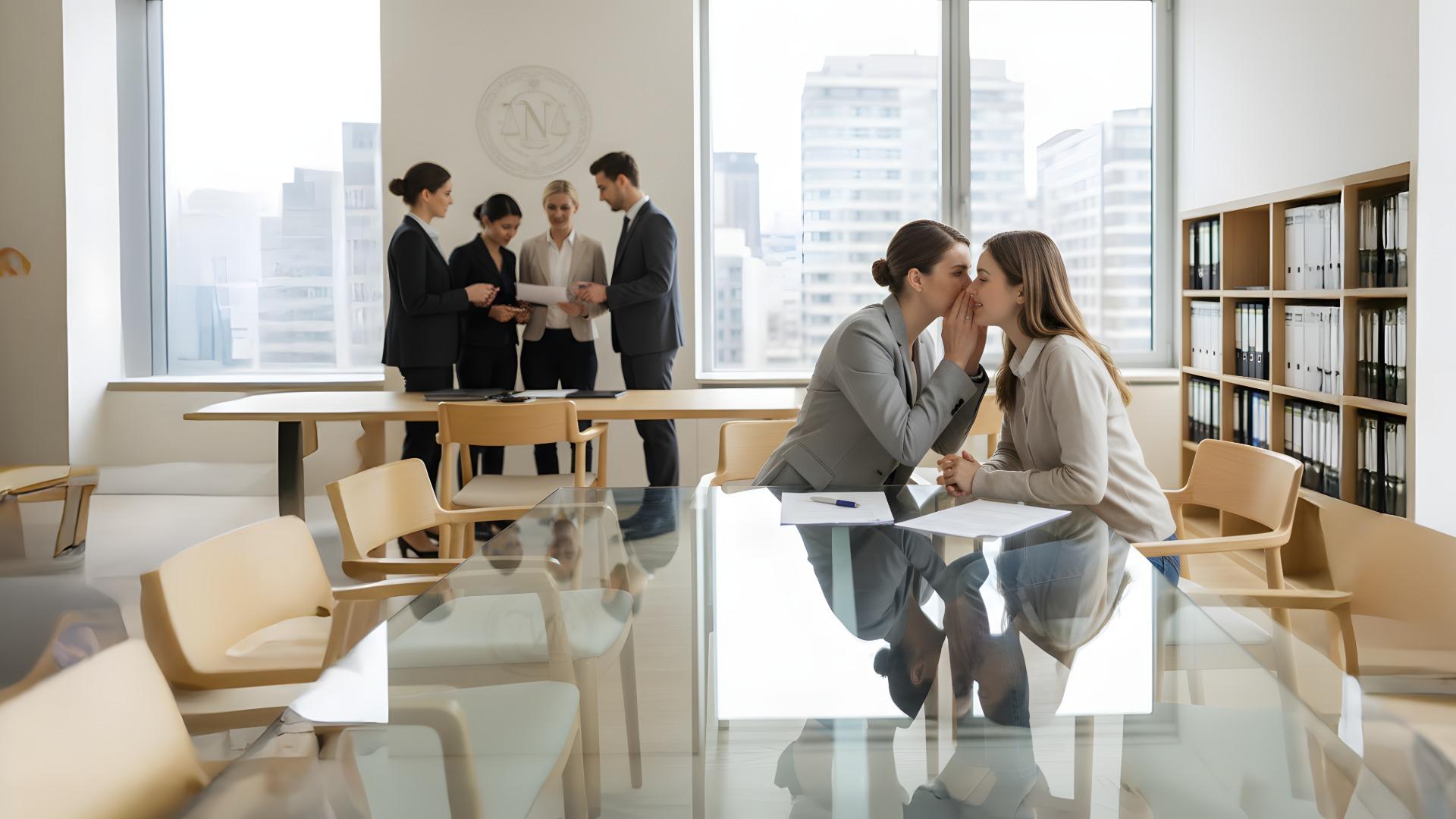 Dos mujeres conversando en una oficina moderna mientras otras personas revisan documentos al fondo, en el contexto de una reunión legal sobre honorarios de abogado por compraventa de vivienda.